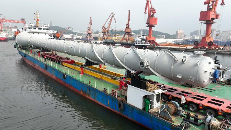 中海壳牌惠州三期乙烯项目做为国度石化财产升级的沉点工程,建成后将成为全球单套规模最大的乙烯安拆之一。大连金沉首批交付的是年产40万吨线性α-烯烃(LAO)安拆6台焦点超限设备——3台高压厚壁反映器取3台超限塔器设备,此次交付的两台超限设备将间接办事于年产160万吨乙烯安拆的焦点反映系统,为整个项目标高效运转供给环节保障。跟着这两台焦点超限塔器设备的成功启运,后续的设备也将按照既定出产打算加速推进制制历程,全力保障每一台设备都能精准满脚项目手艺尺度取交付节点要求,为项目按期投产奠基根本。